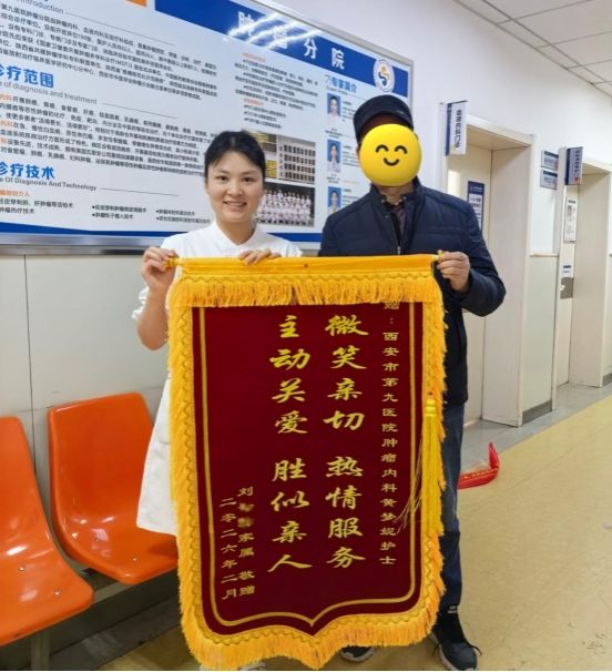 近日,西安市第九医院肿瘤内科静脉通路门诊收到了一份温暖的礼物——患者刘阿姨家属特意送来的致谢锦旗。鲜红的锦旗上,“微笑亲切 热情服务 主动关爱 胜似亲人”十六个... -